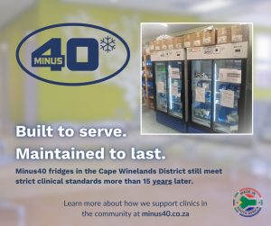 Minus40 values Quality and Service, and that’s why we stand by our solutions years later. Through a Service Level Agreement (SLA), we continue to maintain and service over 30 vaccine fridges across 14 facilities in the Cape Winelands District, including Paarl, Wellington, and Gouda. Minus40 units — some still running strong after 15 years — continue to meet our high standards and clinical requirements, demonstrating our commitment to high-quality manufacturing and service.